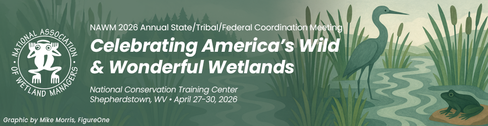 The 2026 meeting will be NAWM's 25th annual coordination meeting! The theme for this year's meeting is Celebrating America’s Wild and Wonderful Wetlands and it will be an amazing opportunity to gather together as a wetland community of practice, build partnerships, and explore new opportunities for wetland protection and restoration. The meeting sessions will cover a range of topics related to the management of our nation's precious wetland resources, with particular focus on wetland stewardship, new pathways for wetlands policy and conservation, effective and creative partnerships, and innovations in restoration.